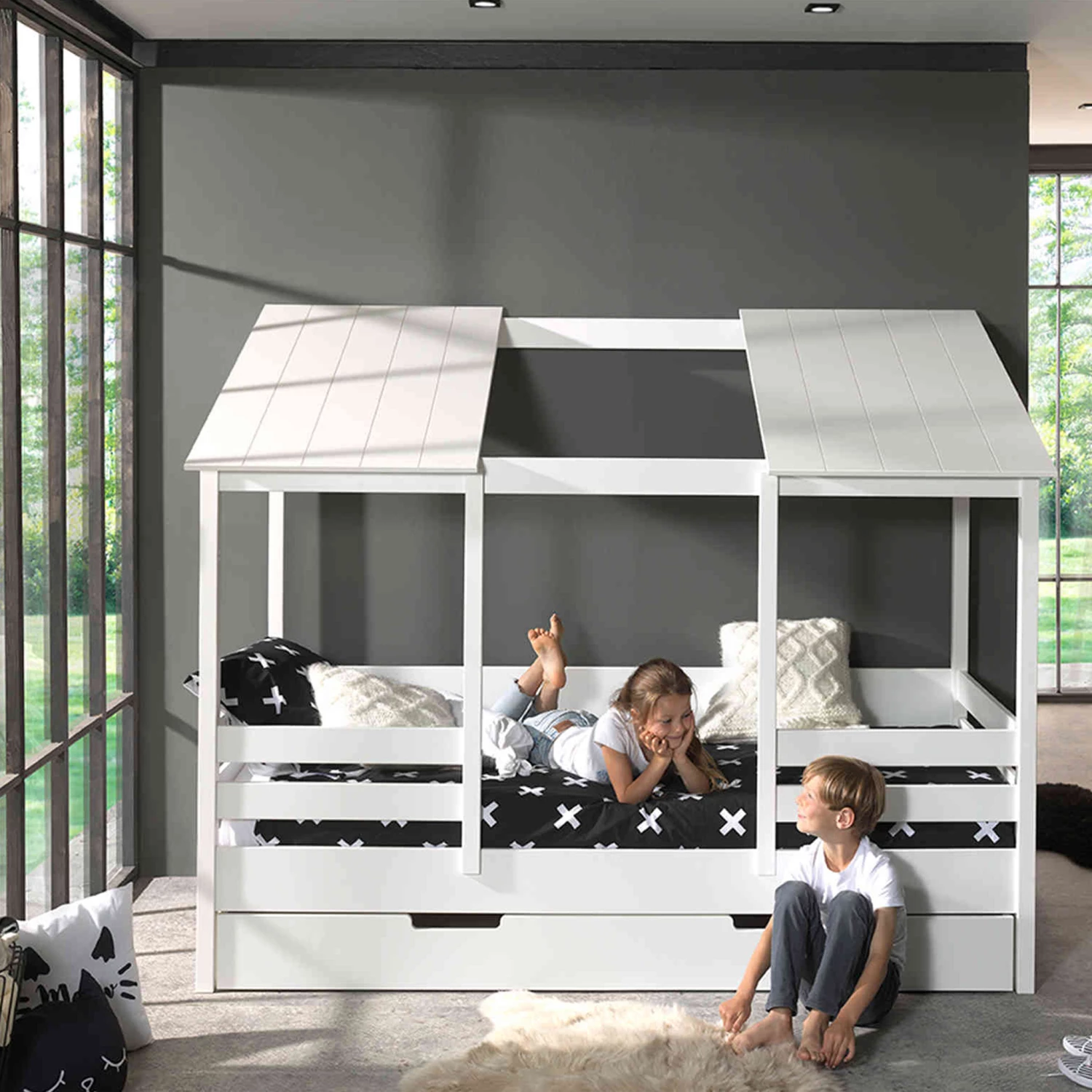 Lit cabane enfant avec toit en bois blanc 90×200 + tiroir de