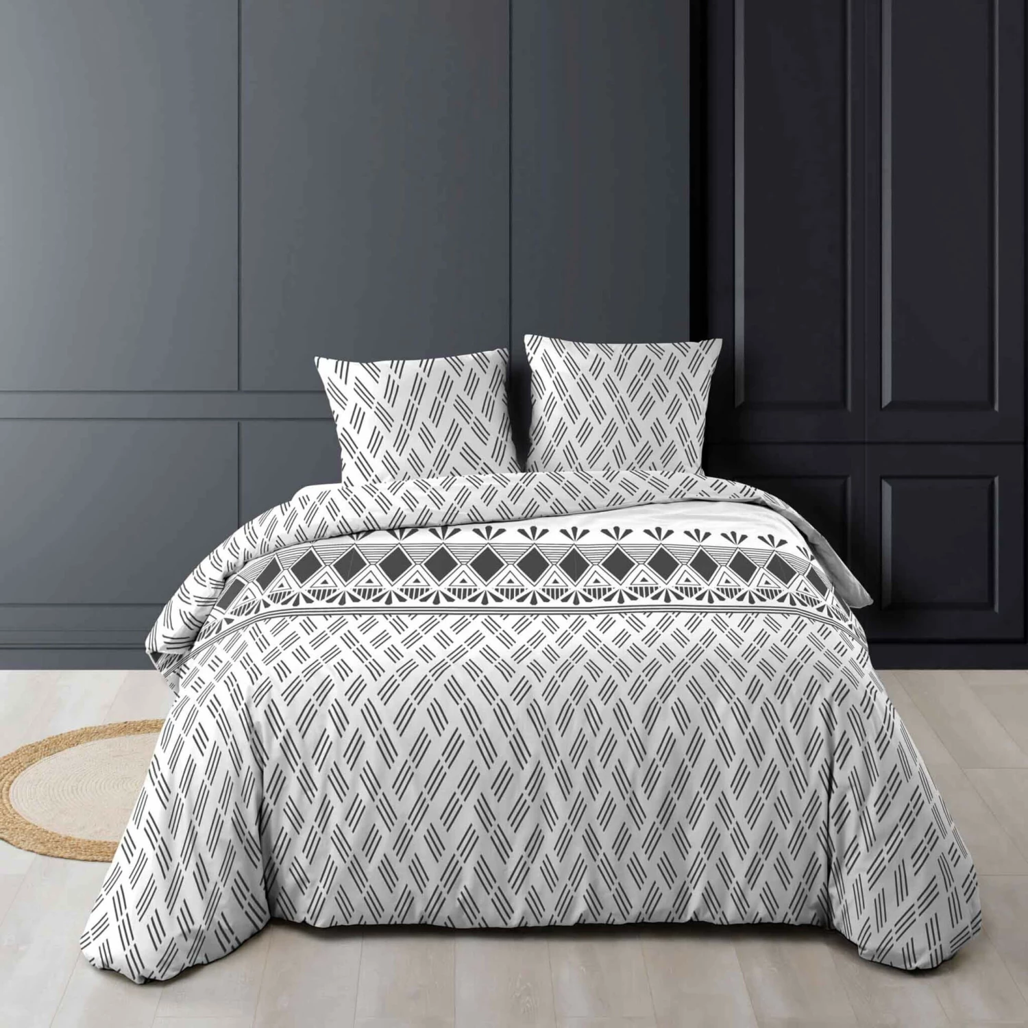 Découvrez la fabuleuse parure de lit Arcadia, de la marque Douceur D’intérieur. Grâce à son imprimé all-over géométrique sur fond blanc avec des nuances de gris tendance, cette parure deviendra l’élément central de votre décoration de chambre.