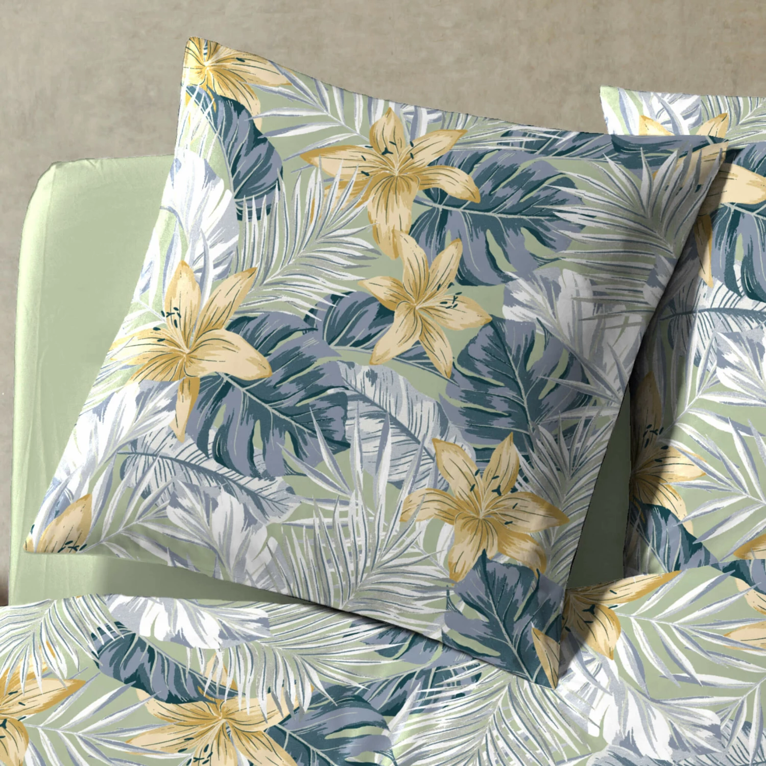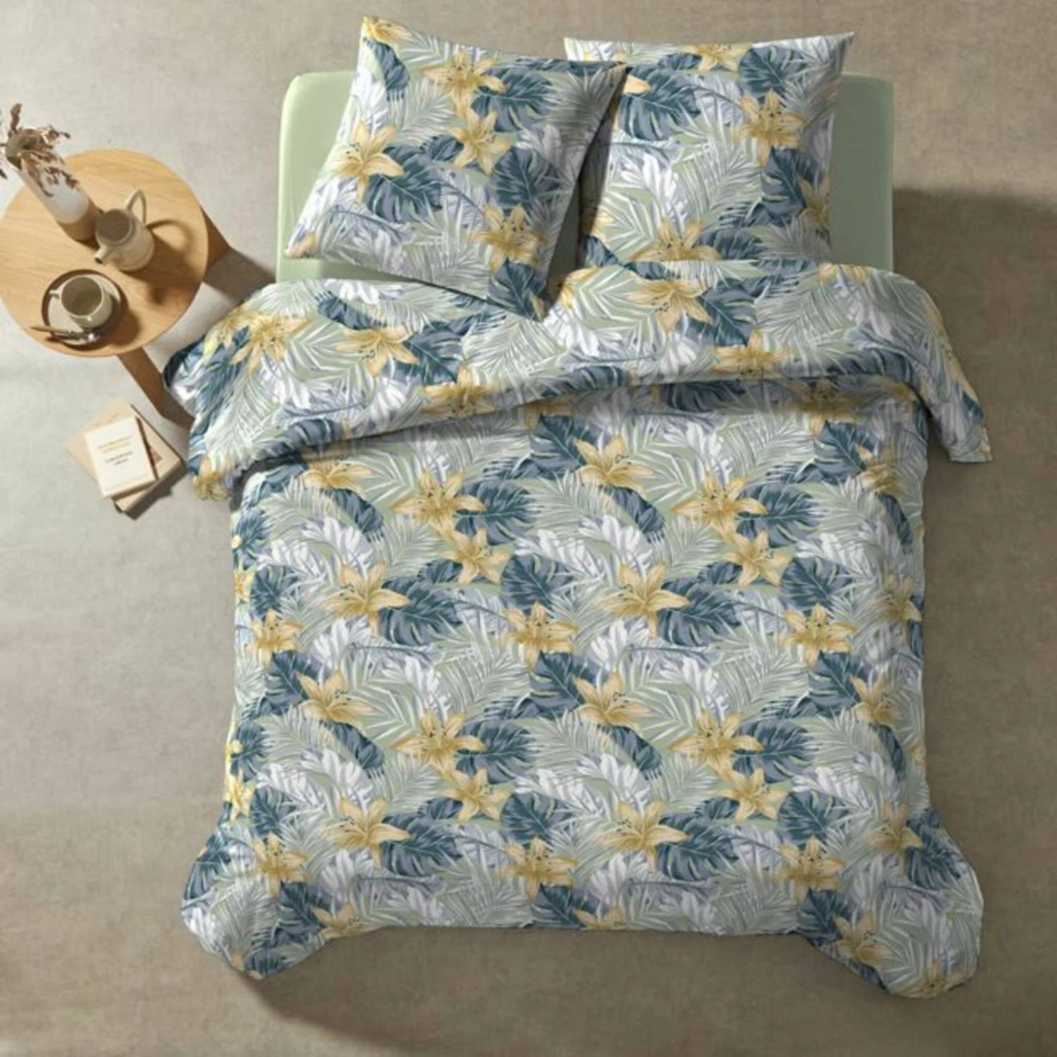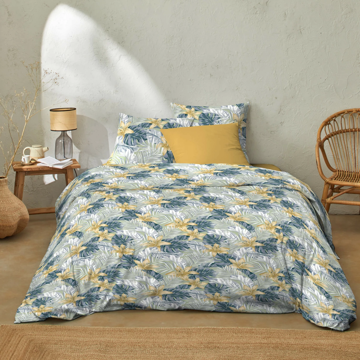 La parure de lit Copacabana Curry, de la marque Terre de Nuit a tout pour vous satisfaire. Voyagez à travers les forêts luxuriantes d’Amazonie avec cette fabuleuse parure de lit Copacabana Curry. Grâce aux motifs de feuilles tropicales, votre chambre prendra vie et une ambiance chaude s’en dégagera.